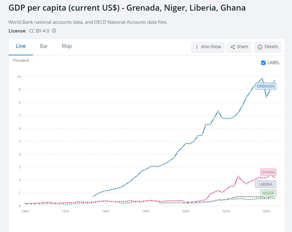 Yes, yes, lots of problems with GDP and prices and all that but they will all be the same problems in the different places - we can compare the different countries at the same time that is. Niger is where (some) slaves came from, Ghana many more and Liberia is where many freed slaves were taken. Grenada is doing very much better than any of them (and you can expand this right across West and Central Africa, the places the slave populations were taken from).