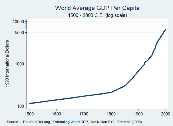 That source of Brad DeLong means yes, this is correct. Where’s that inflexion point, that bend in the curve? About where we start doing capitalism with free markets. As Marx, K himself pointed out capitalism is really very productive.
